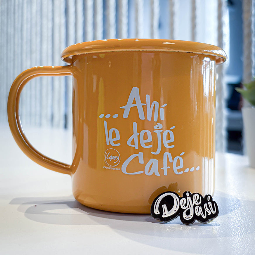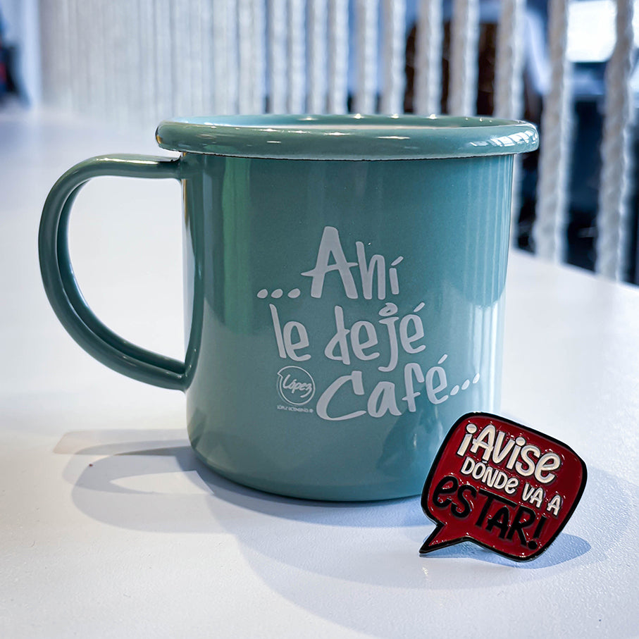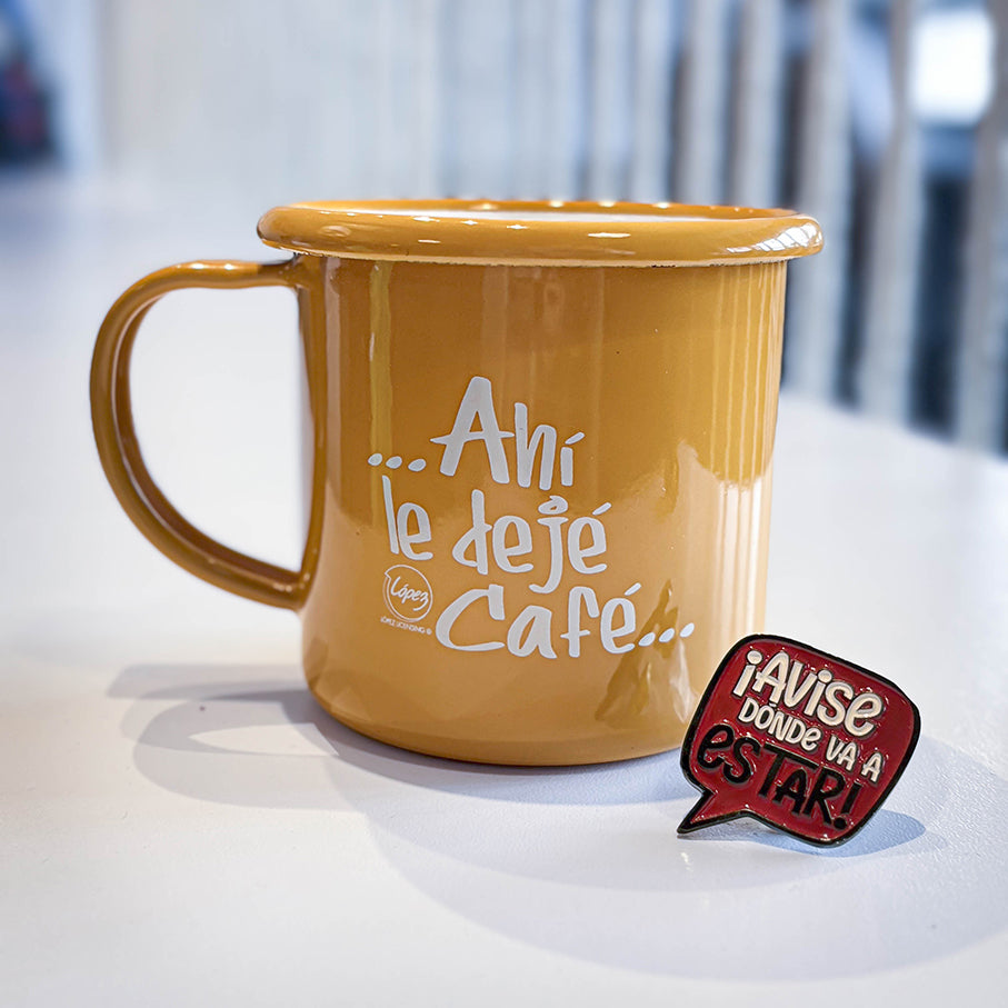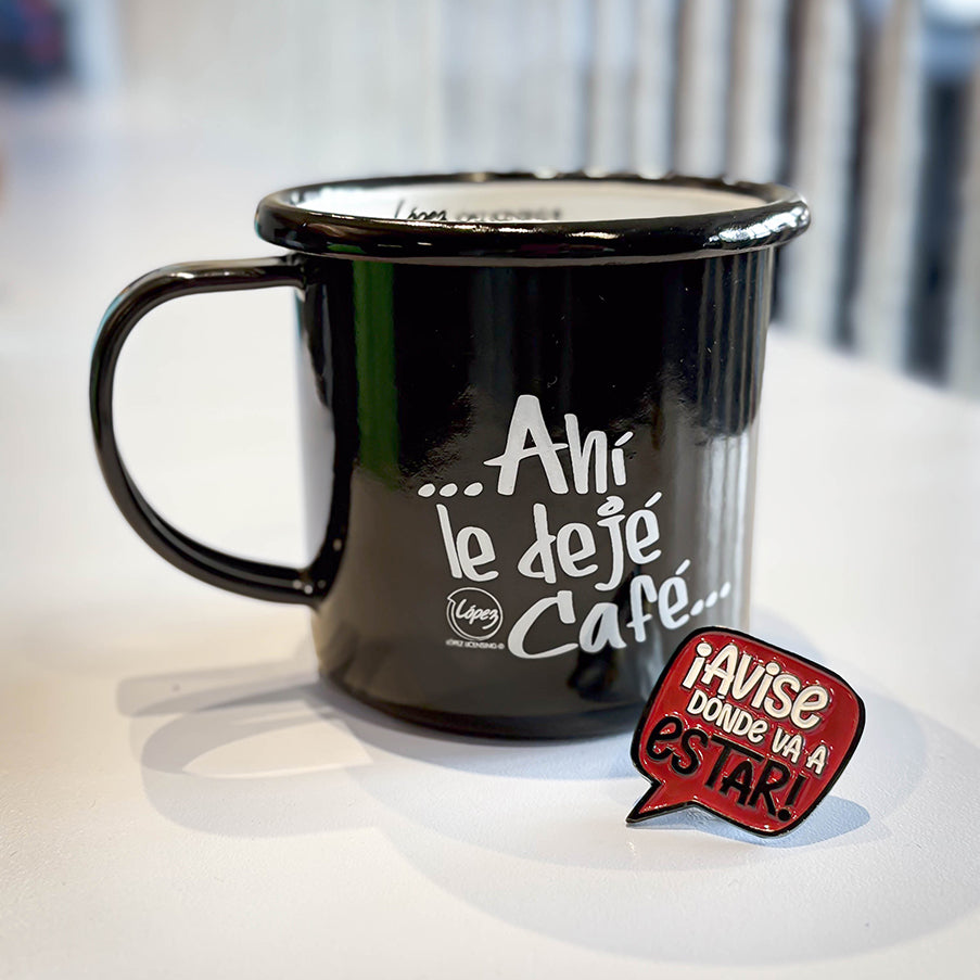 Incluye una (1) Taza de peltre de 14 oz (disponible en negro, amarillo y aguamarina) y dos (2) pines con frases icónicas.